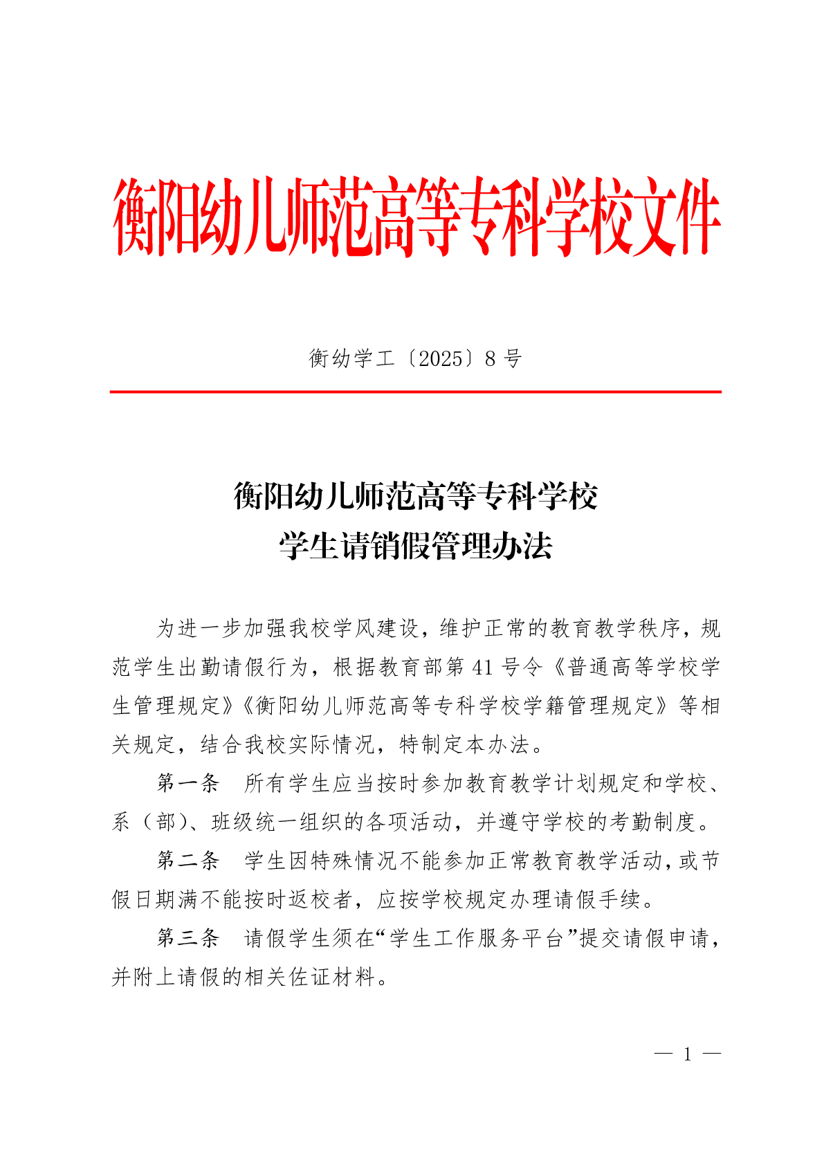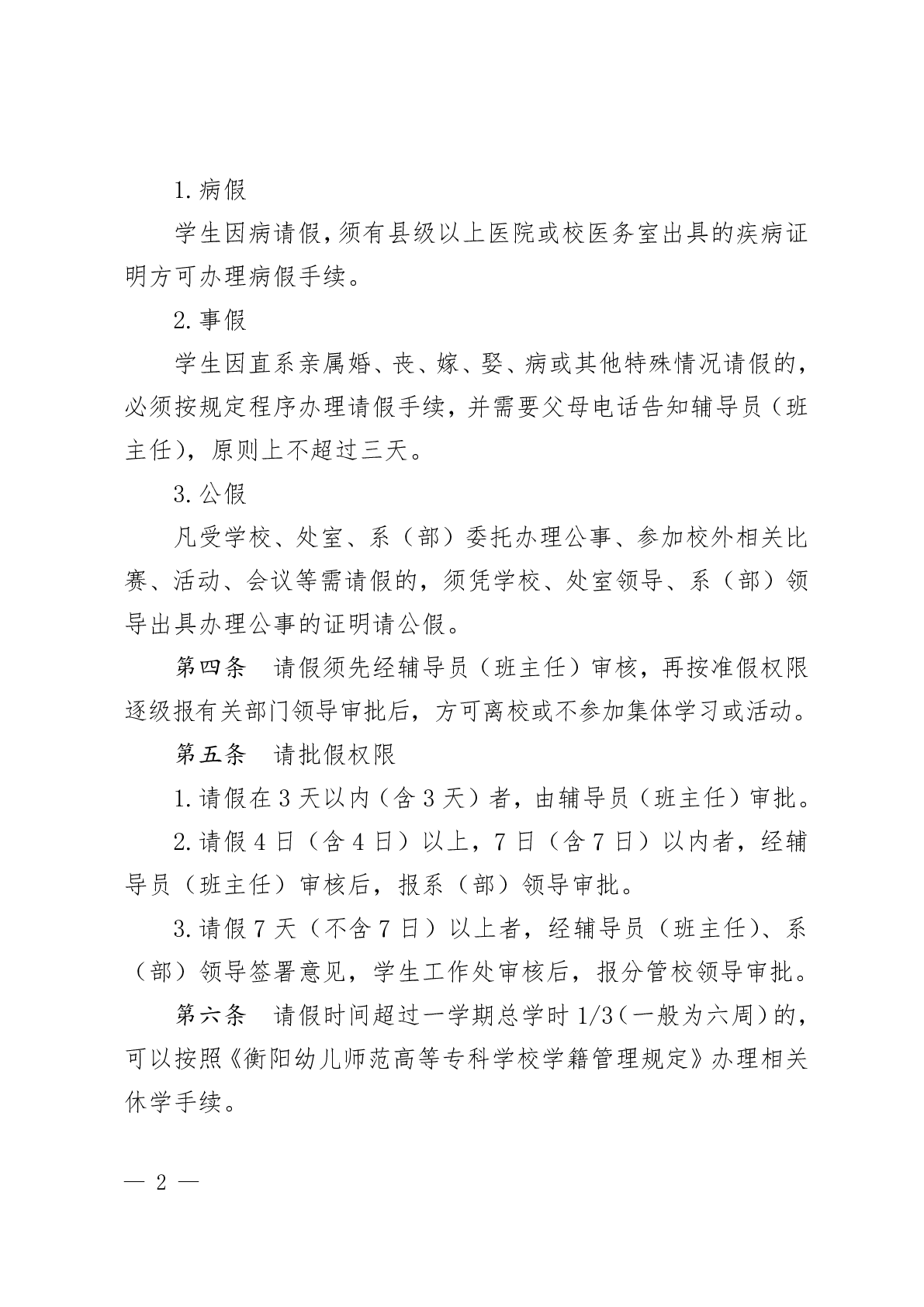 衡陽幼兒師范高等??茖W(xué)校學(xué)生請銷假管理辦法